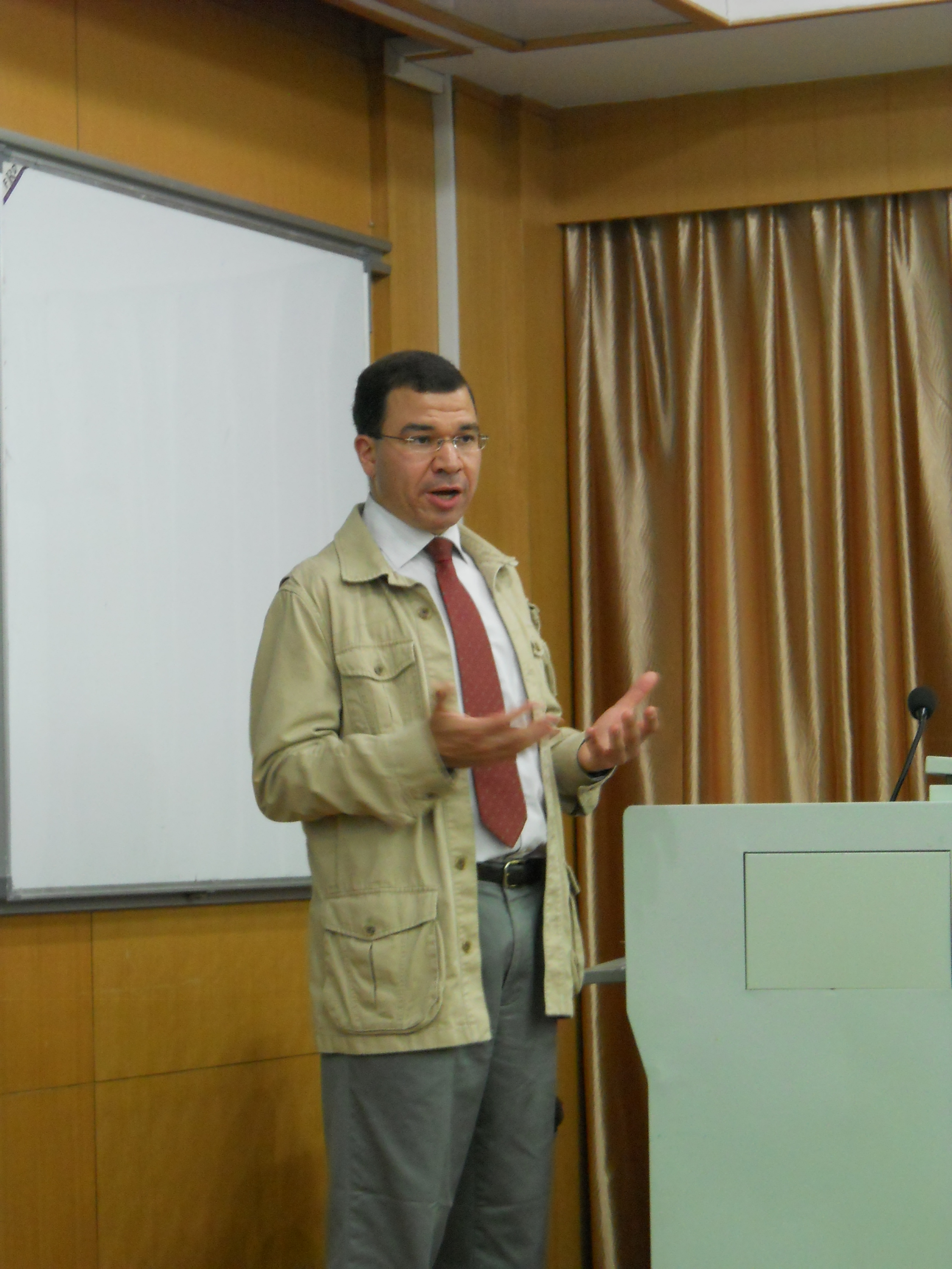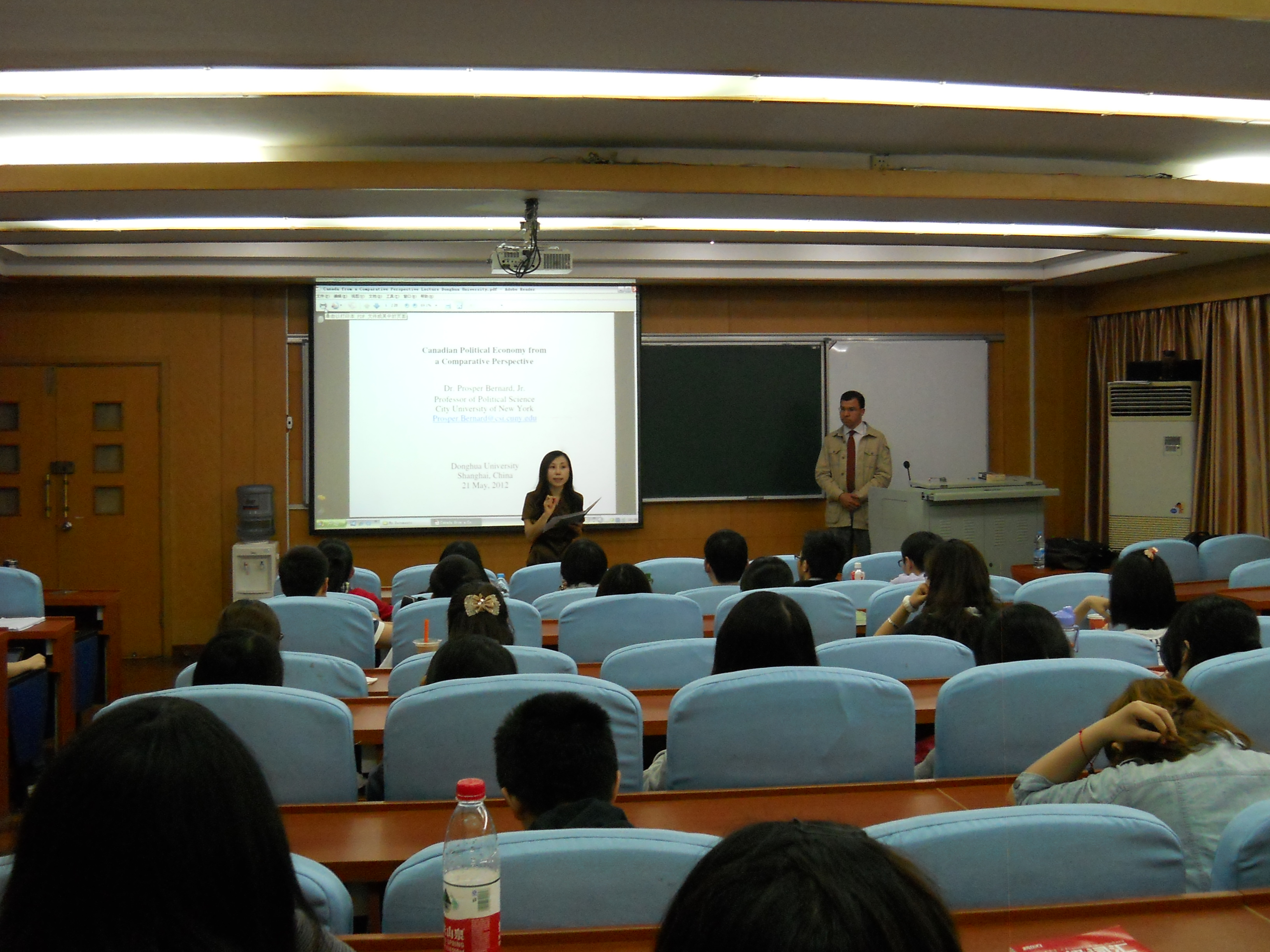 2012年5月22日晚6:30,在旭日楼211教室,纽约城市大学政治经济学教授Prosper Bernard为公司师生带来了一场精彩纷呈的学术讲座。讲座主题为基于比较视角的加拿大政治经济环境解析。出席本场讲座的老师有3044am永利集团官网工商管理系主任沈蕾老师和喻葵老师。