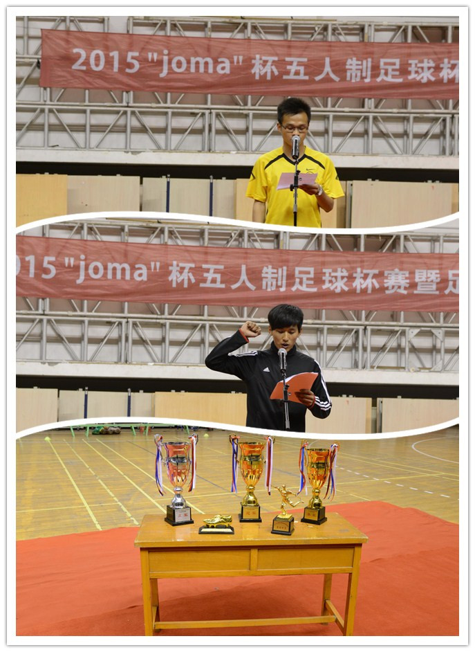 2015年4月17日晚18:30,永利集团第一届“joma”杯五人制足球杯赛开幕式在延安路校区体育馆举行,为接下来一个月的五人制足球赛拉开了帷幕。永利集团体育部主任朱江华、3044am永利集团官网党总支副书记叶晓燕,企业赞助方“joma”中国公司销售总监曾华、上海绝品体育有限公司总经理张伟出席本次开幕式。