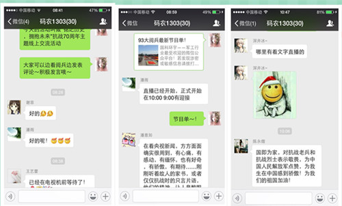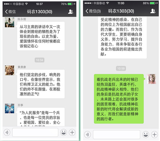 2015年9月3日上午8:30至12:00,信管1303的同学们在班级微信群里开展了 “铭记历史,拥抱未来”——纪念抗日战争胜利70周年线上交流活动,同学们一边看着阅兵直播,一边发表着自己的看法与心声,思想火花迸射,气氛活跃。