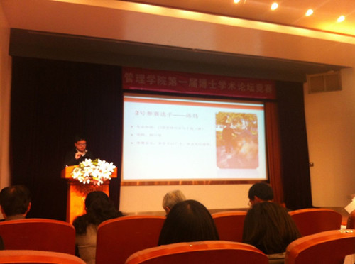 随后,经过层层选拔最终进入管院第一届博士学术论文决赛的八名优秀的参赛选手依次上台展示。第一位参赛选手:罗楚,研究的是关于电子服务质量的相关问题;第二位参赛选手:陈炜,论文题目是《基于延迟定价和回购策略的供应链模型》;第三位参赛选手:刘镜,研究的是关于差异化战略、高管团队人力资本与企业绩效的相关问题;第四位参赛选手:钟榴,论文题目是《基于利益相关者理论的CSR与社会资本关联性研究》;第五位参赛选手:李翼,研究的是关于大学人力资本管理的相关问题;第六位参赛选手:唐承鲲,研究的是关于顾客—企业关系对服务业参与的影响相关问题;第七位参赛选手:狄蓉,研究的是关于服务创新理论的相关问题;第八位参赛选手:许桂苹,论文题目是《生活方式双面构念模型建构研究》。