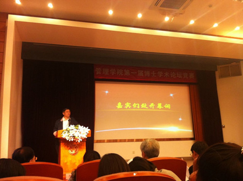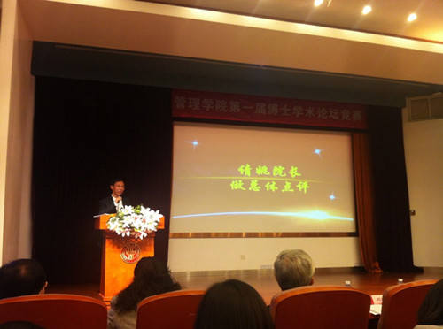2015年11月3日周二下午18:30分,管硕152班的同学积极观摩了在永利集团旭日楼400举行的管院第一届博士学术论文竞赛。此次竞赛邀请了管院各个专业不同学术领域的专家教授组成阵容庞大的评委团,亲临现场对参赛的博士论文进行点评,如姚洪心教授、顾庆良教授、宋福根教授等,以及组织此次博士论文竞赛的众位老师共同参与,如王丽华老师、周蓉老师等。