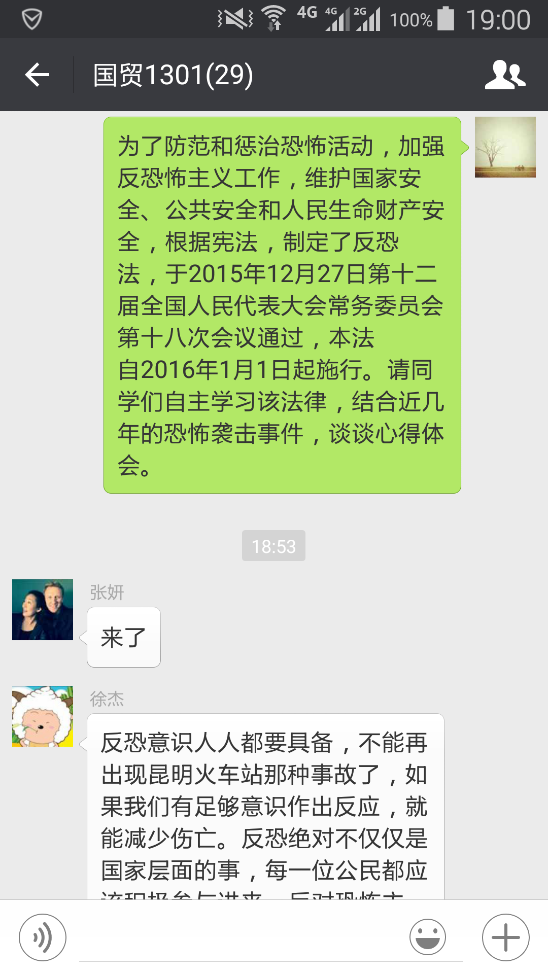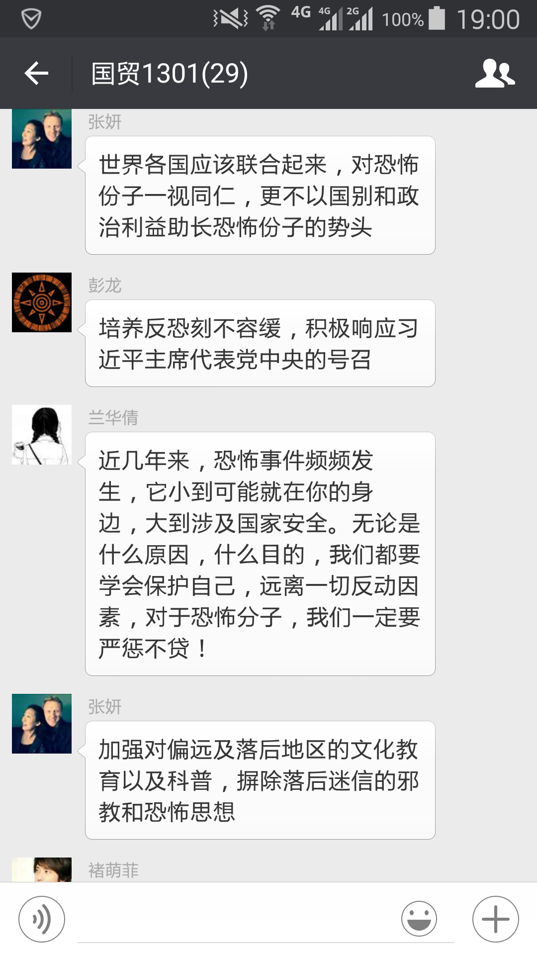 为了让同学们充分认识反恐防暴与自我保护的重要性,树立防范意识,增强自我保护能力,国贸1301班于4月14日晚7点进行了一次以“反恐教育”为主题的微信线上班会活动。