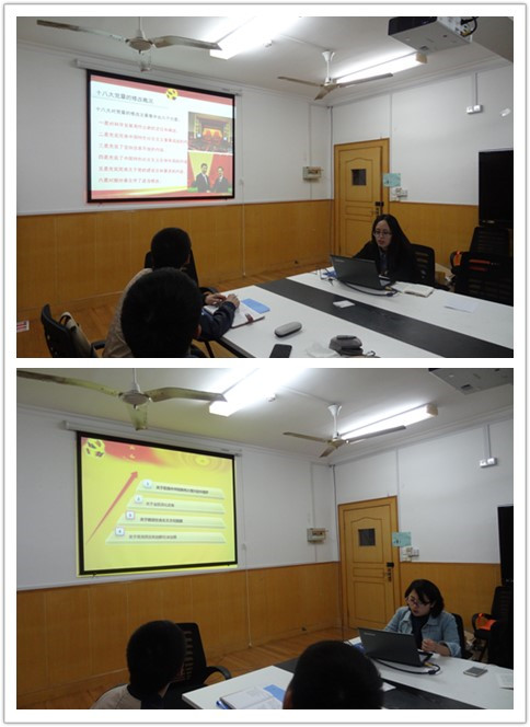 在大家的满怀期待中,活动正式开始了。小组汇报分为三个阶段,围绕的主题是“两学一做”。最先进行汇报的小组是入党积极分子队,小组成员包括邵栗、王靖以及钱凤云,她们汇报的主题是“学党章党规”。因为“党章学习”活动在她们的举办下有声有色,所以大家除了保持肯定更加期待新颖内容。果不其然,三位女将带来的是“十八大新党章”的学习,包括基本内容、修改概况和修改后的党内共识三个部分。积极分子王靖重点介绍了十八大党章的修改概况,修改内容主要集中在六个方面,包括科学发展观的新定位和阐述、中国特色社会主义重要成就的完善、坚持改革开放的充实、中国特色社会主义总体布局的充实、党的总体要求的完善,以及部分条文的适当修改。最后,她从党章地位和重要性两个方面强调了学习党章的必要性,紧接着,她又介绍了党员如何践行党章。她谈到党员要认清共产党的性质、增强党性锻炼、要有很高的思想理论水平、知识业务水平以及自觉性,只有这样才能成为真正的合格党员。