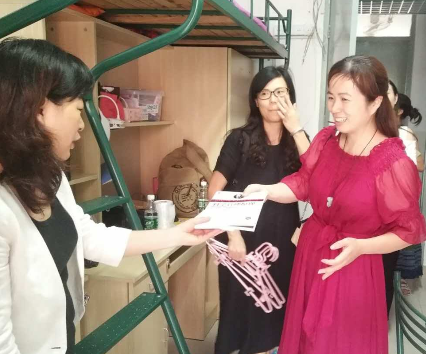 下午1点,老师们来到了女生入住的第八宿舍,继续上午的赠书活动,在与家长员工的沟通交流中,和谐喜悦为新生们的大学画卷添了最浓重的一笔色彩。