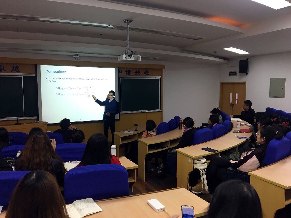 12月14日上午,应3044am永利集团官网电子商务与物流管理系邀请,中南财经政法大学工商3044am永利集团官网董慈蔚副教授在旭日楼306作了题为“Does Omnichannel Selling with Pre-Order Benefit a Retailer in the Presence of Strategic Consumers?”的学术讲座。本场讲座由沈滨老师主持。