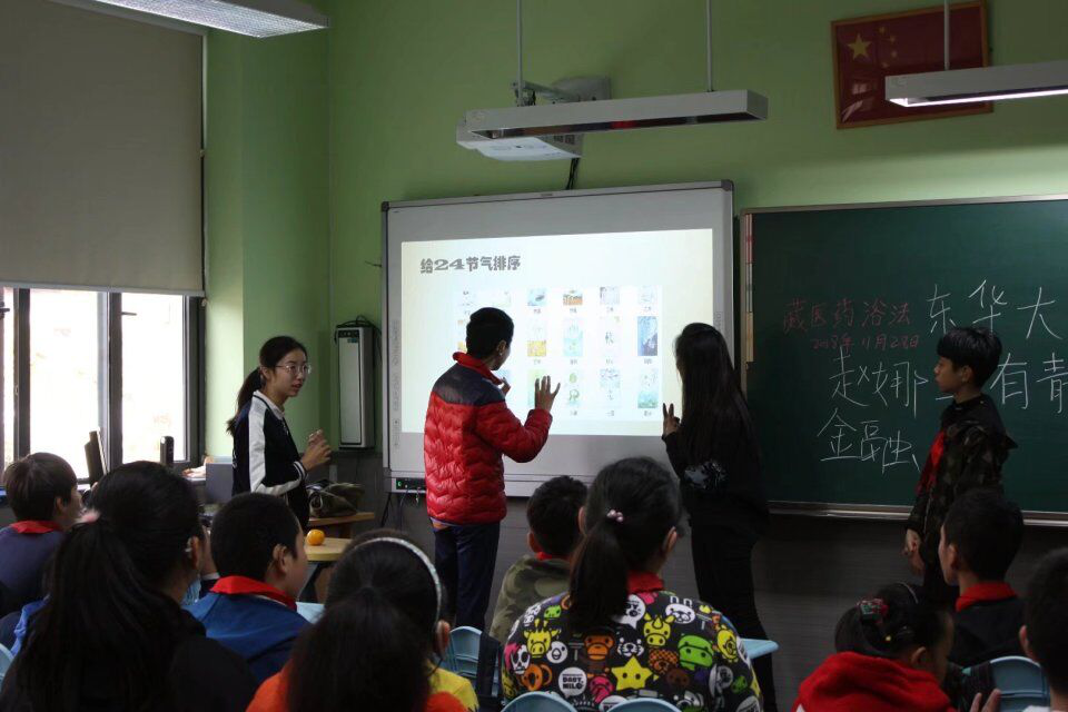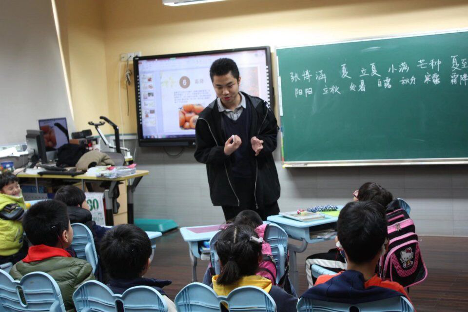 在低年级组,适应他们理解能力稍差的情况,志愿者选择以色彩鲜艳、简单易懂的图片为工具,手把手教小朋友每个节气的读音。对于这种别开生面的介绍二十四节气的形式,同学们感到非常新奇有趣,学习热情高涨。