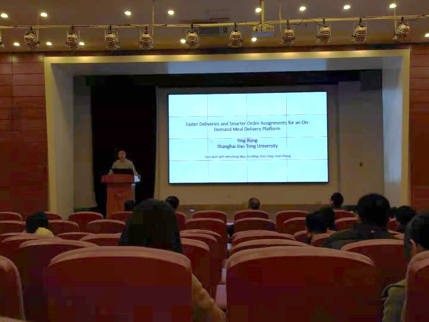 最后一位特邀嘉宾是上海交通大学的荣鹰教授。荣鹰教授获得了国家杰青、多次国际奖项,包括两度MSOM最佳论文奖和INFORMS Energy、 Natural Resources & Environment Young Researcher Prize。荣鹰教授分享的题目是“Faster deliveries and smarter order assignments for an on-demand meal delivery platform”。外卖配送问题是近年来的一个研究热点,通过分析杭州外卖的一些实际数据,发现“延迟交货”对未来订单的负面影响远大于“提前交货”的正面影响。此外,骑手的个人知识和先前的送货经验可以显著减少延迟交货。最后,通过模拟研究说明了如何将经验知识结合到订单分配策略的开发中,以帮助平台有效保留客户并增长业务。