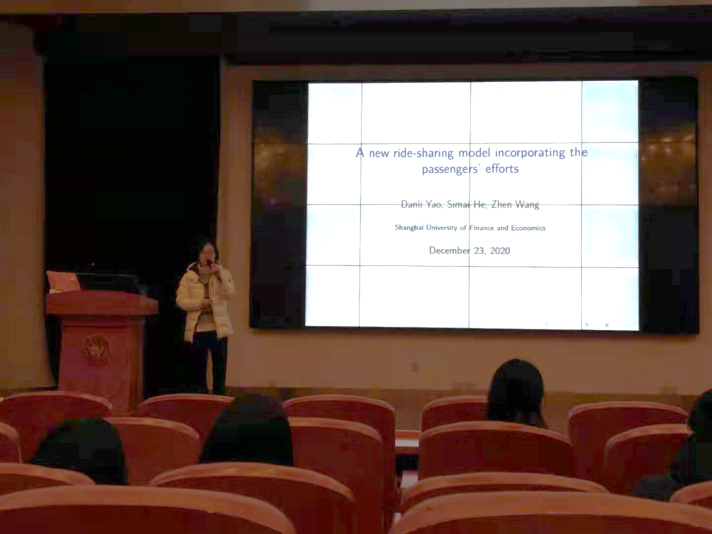 第三位青年学者是上海财经大学的姚丹丽。姚丹丽博士的报告主题是“A new ride-sharing model incorporating the passengers’ efforts”,主要研究对有拼车意愿的乘客如果通过调整乘客的步行距离要求来提升总体拼车成功率。