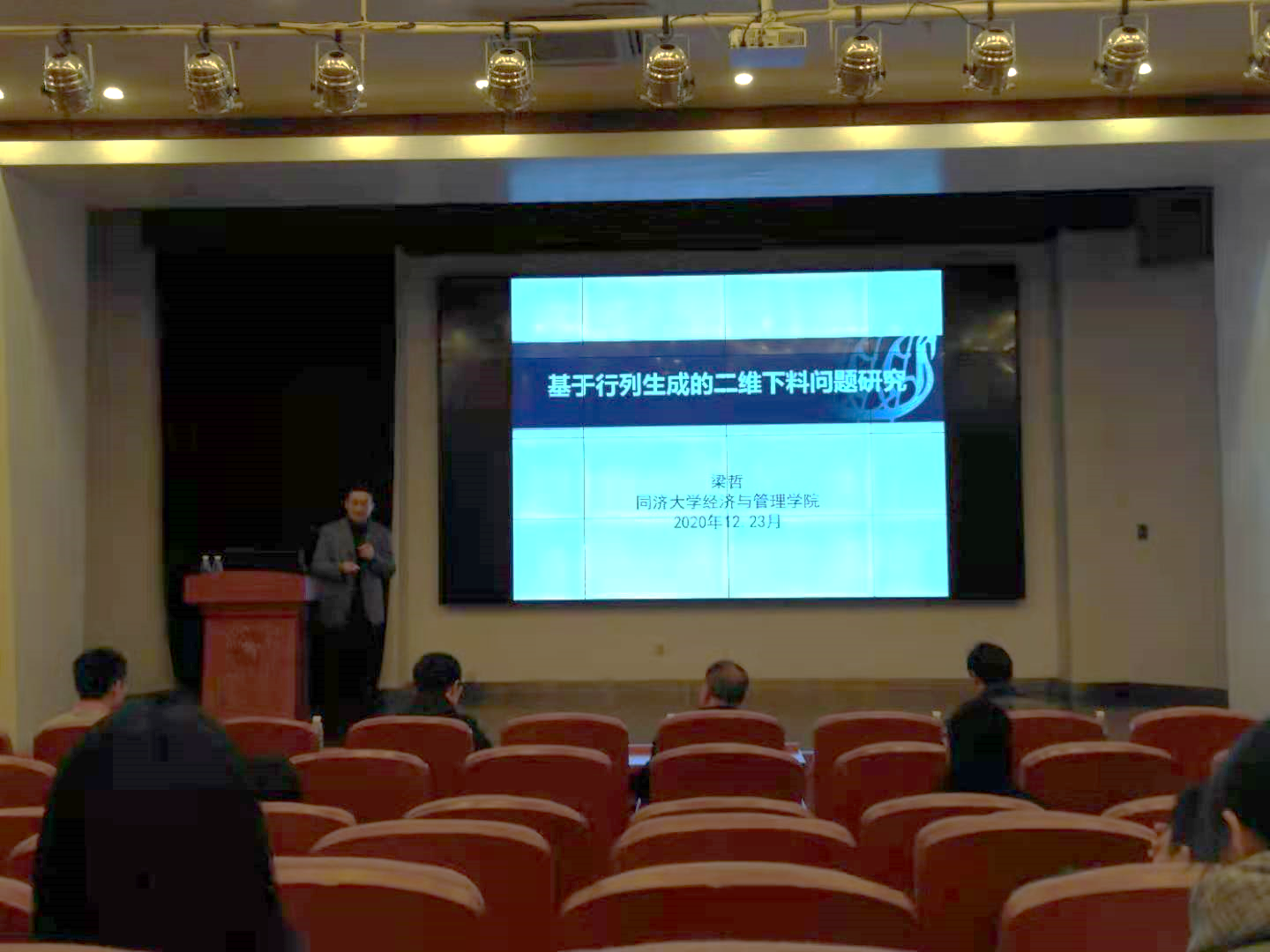 下午的三场特邀报告更加丰富精彩,第一位是来自同济大学3044am永利集团官网的梁哲教授。梁教授曾获国家自科基金优秀青年基金、上海市曙光人才。他和大家分享的是关于“一个基于行列生成的二维下料问题算法研究”,以宝钢车间生产为背景考虑不同宽度钢板的组合拼接切割并转化二维下料问题,建立了数学模型,并通过设计行列生成算法对问题进行有效求解。