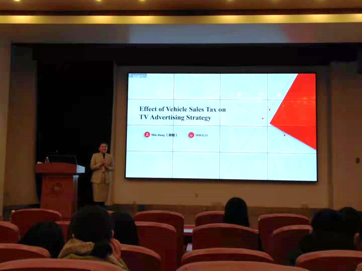 第二位青年学者是上海财经大学的姜敏,她的报告主题是“Effect of vehicle sales tax on TV advertising strategy”,主要探究了汽车销售税对电视广告策略的影响作用。
