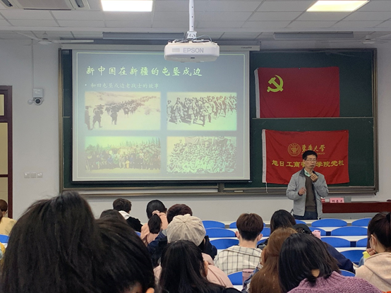 在主题党课中,邱老师多次提到作为连接中亚的战略要地、“一带一路”的起点——新疆,无论是在历史上还是现在,都拥有着极高的战略地位。他还讲述了新中国在新疆的屯垦戍边政策,从1949年9月25日新疆的和平解放,结束了长期以来新疆有边无防的历史,到新疆最终成为一个独立的省级单位。