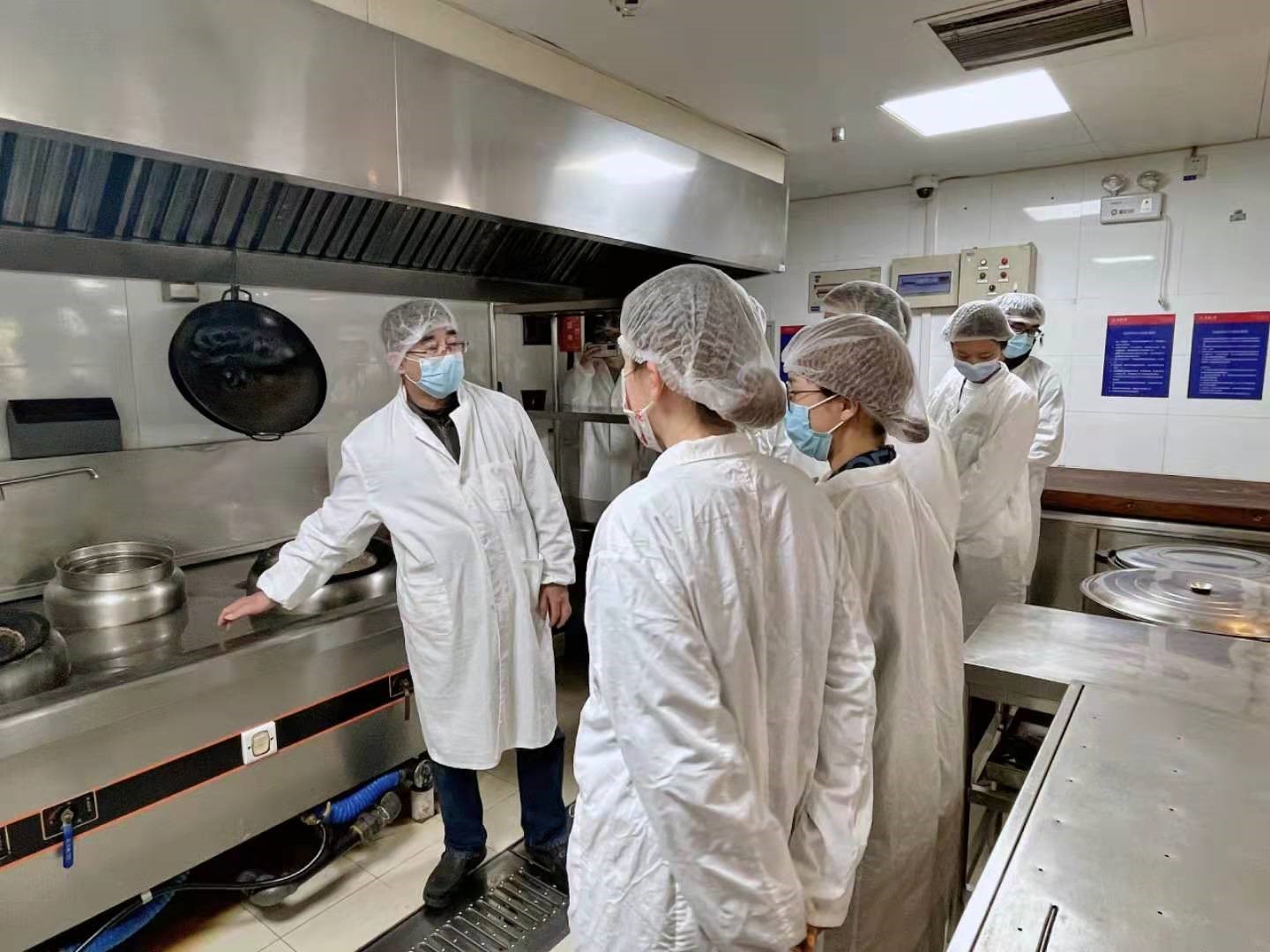活动开展前,参观员工根据食堂卫生安全要求佩戴好口罩,更换统一的工作服和工作帽,随后在饮食管理中心负责老师带领下进入第一食堂后厨参观。负责老师首先简要介绍了公司第一食堂的运行情况,并结合展板对公司食堂“6T”事物现场管理标准进行了详细说明,即天天处理、天天整合、天天清扫、天天规范、天天检查和天天改进,对食堂服务、安全、卫生进行全方位把关,保障全体师生和工作人员的餐饮安全。