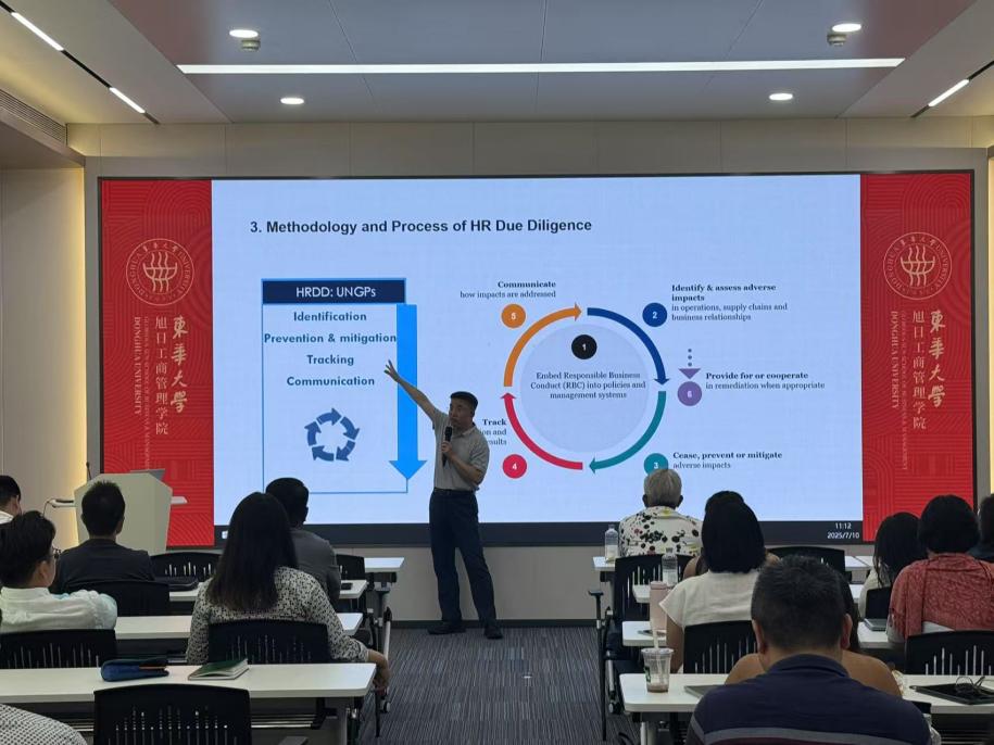 中国纺织工业联合会的梁晓晖博士在纺织行业政策研究、产业规划等方面拥有丰富经验,对行业前沿动态有着精准的把握。他为学员们带来了关于纺织行业前沿信息和发展趋势的课程,重点讲解了 ESG(环境、社会和公司治理)理念以及可持续发展在纺织行业的实践,详细介绍了 HRDD(人权尽职调查)标准等国际通用准则。通过梁晓晖的讲解,学员们了解到纺织行业在绿色发展、社会责任履行等方面的最新要求和发展方向,为今后在 “一带一路” 纺织产能合作中践行可持续发展理念奠定了基础。
